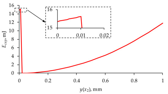 Using Formulas (6) and (7), the energy required to power the converter and the accompanying electrical voltage were determined for all variants of material combinations (40 different combinations in total). As already mentioned, the force F is caused by the pressure difference between the lower surface of the transducer and the valve seat. This force disappears as soon as the valve is opened. Thus, with an effective opening equal to heff (Figure 7), the force F does not occur. The results obtained, determined at the effective opening of the valve (y(x2) = heff = 0.4 mm) and at F = 0, are presented in Table 3.