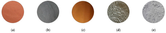 The ordinary Portland cement (Figure 1c) used in this study had a strength grade of 42.5 and came from the Taiyuan Lionhead Cement Plant. Fly ash (Figure 1d) was collected from Taiyuan No. 1. The thermal power plant, Taiyuan, Shanxi, China, contained large amounts of and , which were used as partial cement replacements in this study. Carbide slag (Figure 1e) was collected from Yushe Chemical Co., Ltd, Taiyuan, Shanxi Province, China. and was beige, with CaO as the main chemical composition. The chemical compositions of the three hardened materials are shown in Table 2.