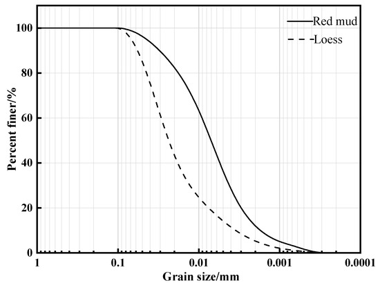 The RCL was formulated in the laboratory. The red mud used in this study (Figure 1a) was obtained from the Liulin aluminum plant in Taiyuan, Shanxi Province, China. The red mud employed in this work is a highly alkaline leftover from the Bayer process [32], which extracts alumina from produced bauxite, accounting for more than half of and . The loess has a yellow appearance. Its plastic limit is 14.55%, the liquid limit value is 25.03%, and the plasticity index is 10.48%, which is typical of reconstituted loess from Shanxi (Figure 1b). According to Figure 2, the uniformity coefficients for red mud and loess were 6.68 and 8.32, respectively, and the curvature coefficients of red mud and loess were 1.401 and 1.648, respectively.