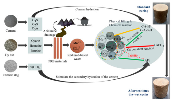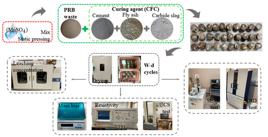 Accordingly, the objective of this study is to investigate the effect of w-d cycle on the durability of CFC solidified PRB waste. This study is based on a nonrecyclable PRB waste, consisting mainly of a 7:3 mixture of red mud and loess [31], solidified with CFC to investigate the mechanical and leaching properties under the influence of w-d cycles, and microscope analysis by scanning electron microscopy (SEM), energy dispersive spectroscopy (EDS), and X-ray diffraction (XRD). This research can provide feasible solutions for the use of PRB solid waste in practical engineering.