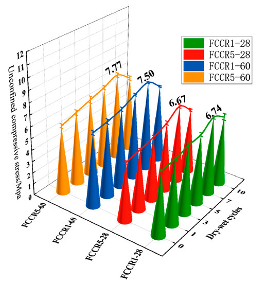 (1) There was a clear trend of increasing intensity in the UCS of FCCR during the first seven cycles and then the intensity decreased. This cementitious curing agent, under the influence of wet and dry cycles, shows excellent durability.