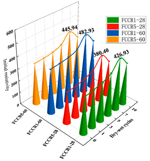 From the 7th w-d cycle, the degree on the soil gradually increases, the soil particle skeleton is compressed, the soil is damaged, the larger pores between particles are compressed into tiny pores, the pore water saturation increases, and the pore water conductivity is enhanced; thus, the resistivity shows an attenuation trend. As the pore water saturation rises and the pore water’s electrical conductivity rises, the resistance falls. Because manganese ions are innately conductive, they affect FCCR resistivity. The stronger the conductivity and lower the resistivity of the soil, the higher the ion concentration in the pore solution, which is also consistent with the trend in UCS with ion concentration.