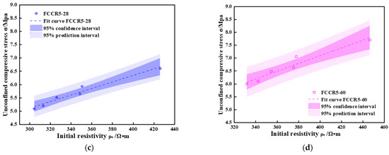 Relationship between UCS and IR. (a) UCS and IR fit curve of FCCR1-28; (b) UCS and IR fit curve of FCCR1-60; (c) UCS and IR fit curve of FCCR5-28; (d) UCS and IR fit curve of FCCR5-60.