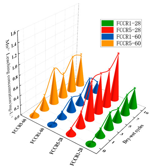 Figure 7 depicts the increase in leaching concentration as the number of w-d cycles increases. The leaching concentration of FCCR increases and then stabilizes as the number of w-d cycles increases, but all of these values are below the primary effluent discharge standard of 2.0 , indicating that they will not harm the production and living environment or the human body [43]. The concentration of leached ions can detect a noticeable rise between zero and three cycles of the w-d cycle. This is because each w-d cycle develops small cracks on the surface and interior of the sample [46], resulting in increased ion leaching and FCCR mass loss. When the sample undergoes three w-d cycles, the leached concentration tends to stabilize or even decrease: with the continuous hydration process, hydration and calcium silicate hydrated (C-S-H) gelation products were generated, among which and easily dissolved water-soluble formed precipitates. was easily oxidized to the more stable tetravalent manganese oxide in the alkaline environment, and the hydration products C-S-H and AFt increased after the large consumption of in the later phase. The system was mainly responsible for solidifying the continuously dissolved water-soluble : hydration products’ physical adsorption and encapsulation. FCCR5-28 also had the largest concentration of leached and, as a result, the lowest UCS, implying that the initial concentration significantly impacts the FCCR’s w-d cycle endurance.