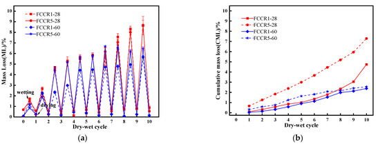 As shown in Figure 9b, under the effect of w-d cycles, the cumulative mass loss of FCCR at higher concentrations was much more significant than that at lower concentrations. Compared with the initial mass, the cumulative mass losses in the last w-d cycle (No. 10) increased by 2.97% for FCCR1-28, FCCR5-28, FCCR1-60, and FCCR5-60. This phenomenon occurs because the high concentration of invades the surface pores of the sample, resulting in peeling of the sample skin and loosening of the internal structure, leading to significant quality changes. The strength and leaching ion concentration of the soil sample also changes significantly.