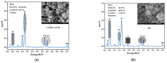 SEM images of specimens at 28 days of curing time were chosen. Figure 11a–d show SEM images at various magnifications without the w-d cycle, whereas Figure 10 and Figure 11e show SEM images at various contaminant concentrations with the w-d cycle. The atomic Ca/Si ratio of C-S-H is an important composition parameter that affects nonstructural characteristics of C-S-H (usually Ca/Si between 1.0 and 1.7 represent C-S-H) [51]. Referring to EDS component analysis results (see Figure 12), it is evident that a large amount of needle/rock-like calcified material formed in the soil samples after 28 days of curing time, that is, a massive amount of C-S-H/C-A-S-H and AFt was generated [51,52,53]. Through hydration, the glass beads of fly ash and needle-like ettringite are wrapped or bonded together by the flocculent C-S-H/C-A-S-H gel component, which binds the different forms together to form a denser structure, which is the main reason for providing soil strength. At room temperature, tricalcium silicate dicalcium silicate () and dicalcium aluminate () in the cement hydrate create C-S-H and . During the chemical reaction, fly ash is activated over time by produced by the hydration of the cement and by contained in the calcium carbide slag itself, and from the pore fluid breaks Si-O-Si and Al-O-Al bonds, the hydrated calcium silicate C-S-H and hydrated calcium aluminosilicate C-A-S-H with are generated with gelling activity, and the C-A-S-H is excited by , , to generate the water-hardened AFt. Fly ash is primarily responsible for filling the microporous aggregates and reducing the water consumption during the reaction [54]. The flocculent C-S-H/C-A-S-H gels produced in FCCR can bind fine particles together and further promote the assembly of agglomerates. Therefore, the appearance of C-S-H/C-A-S-H gels is a key factor to improve the strength and durability of FCCR, especially for samples with long-term curing, which is also consistent with the study of [55].
