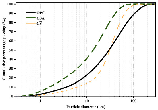 In this investigation, ordinary Portland clinker, calcium sulphoaluminate clinker, and anhydrite (China Building Materials Academy, Beijing, China) complied with the requirements of the Chinese standards GB/T 21372-2008, GB/T 37125-2018, and GB/T 9776-2008, respectively. Table 1 presents the chemical compositions and physical characteristics of cementitious materials. The particle size distributions of powdered materials were measured using the laser scattering technique and the test results are given in Figure 1. The mix proportions of the different OPC-CSA-CS ternary systems used in this study are shown in Table 2. For example, 1-9-5 represents an OPC/CSA ratio of 1:9 and a CS dosage of 5%. The proportion of OPC to CSA ranges from 1:9 to 9:1 under different CS contents (5 and 10%).