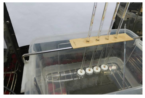 The chemical shrinkage testing procedure was identical to ASTM C1608. Figure 2 shows the equipment used for the chemical shrinkage testing. Firstly, we filled the glass vial with an appropriate amount of fresh cement paste. It is best to cover the bottom of the vial with a 5 mm-thick layer. The vials needed to be tapped several times to minimize the amount of air trapped. Then, we slowly filled the glass vials with water without any agitation until it overflowed. We then inserted a rubber plug with a pipette into the vial and adjusted the water level in the pipette to a specified scale. Colored oil was injected into the tube with a long needle to reduce the moisture volatilization and enable it to be read conveniently. In order to prevent the water from overflowing during the testing process, sealant was used to seal the area of contact between the pipette and the rubber plug, as well as the contact point between the rubber plug and the bottle mouth. The equipment was placed in a constant-temperature water bath at 23 °C. Measurements started one hour after mixing.
