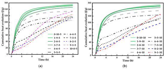 Cumulative hydration heat evolution of ternary blends with different CS contents: (a) with 5% CS; (b) with 10% CS.