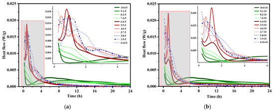 Hydration heat flow of OPC-CSA- CS ternary blends with different CS contents: (a) with 5% CS; (b) with 10% CS.