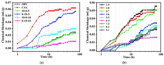 Figure 6 shows the chemical shrinkage results of OPC-CSA-CS ternary systems with different OPC to CSA ratios and CS dosages. In the case of ternary systems with 5% CS (see Figure 6a), the chemical shrinkage increased with the increase in the proportion of CSA. An opposite trend, however, was noticed in ternary systems with 10% CS (see Figure 6b), where increasing CSA generally led to a lowering in the chemical shrinkage; the lowest value was found for the binder without OPC. The probable reason for the higher total amount of ettringite formed in this blend is the ettringite-formed reaction occurring between portlandite and aluminum hydroxide.