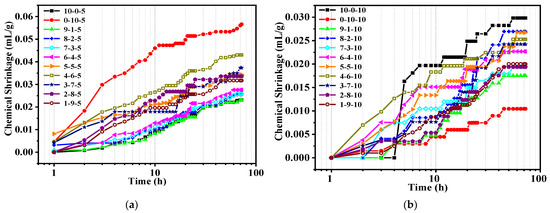 Chemical shrinkage of ternary systems and comparison: (a) with 5% CS; (b) with 10% CS.