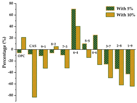 To better evaluate the influence of the addition of CS on the chemical shrinkage, the percentage was calculated by the difference between ternary blends and binary systems with the same OPC/CSA ratio based on the OPC-CSA system; the results are plotted in Figure 7. Positive values indicate an increase and negative values indicate a reduction. With the addition of 5% CS, the chemical shrinkage percentage of three groups, whose OPC/CSA ratios were 6/4, 5/5, and 4/6, respectively, showed a tendency to increase, while other groups showed a tendency to decrease. The largest increase of up to 70.6% appeared in the 6/4 ratio and the biggest reduction of up to 42.4% appeared in the 1/9 ratio. Likewise, for OPC-CSA-10%CS blends, the chemical shrinkage of most groups was decreased, except for the neat OPC, 8-2, and 4-6 systems. Additionally, the 6-4 group still displayed the largest rise in chemical shrinkage, while the pure CSA group showed the greatest reduction of up to 83%. Moreover, in the situation where there was a high CSA proportion (OPC/CSA < 5/5), the chemical shrinkage of ternary systems decreased with the decrease in the OPC/CSA ratio regardless of the CS dosage. By contrast, there was no obvious pattern of change in the case of a high OPC proportion.