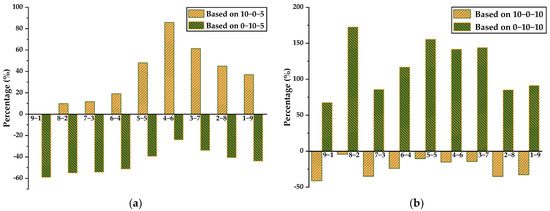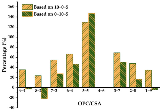 Similarly, the effect of the OPC/CSA ratio on the chemical shrinkage of ternary binders at a fixed CS content is plotted in Figure 8. It can be seen that based on the OPC-CS blends, the incorporation of CSA promotes the chemical shrinkage of OPC-CSA-5% CS and causes the growth percentage to first increase and then decrease with the increase in the amount of CSA added. When taking CSA-CS blends as a reference, with the increase in OPC mass ratio, the percentage of reduction first decreased and then increased. A similar discussion could be conducted for the addition of 10% CS, where the opposite effect was observed.
