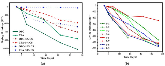 Drying shrinkage of unitary systems and binary systems: (a) OPC or CSA or OPC-CS or CSA-CS blends; (b) OPC-CSA blends.