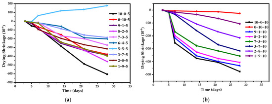 Drying shrinkage values of different pastes: (a) with 5% CS; (b) with 10% CS.