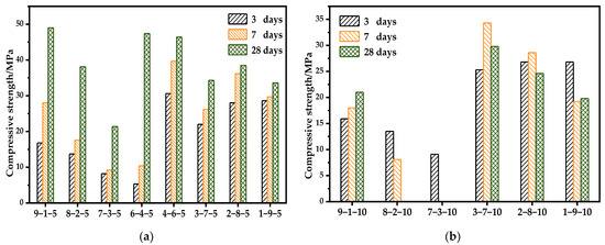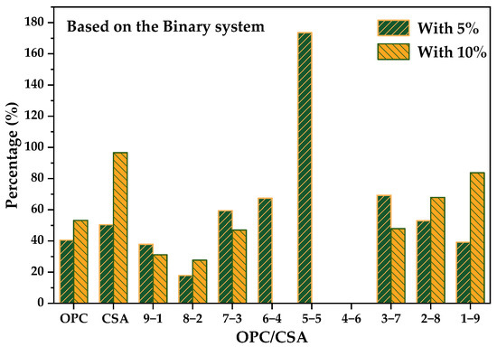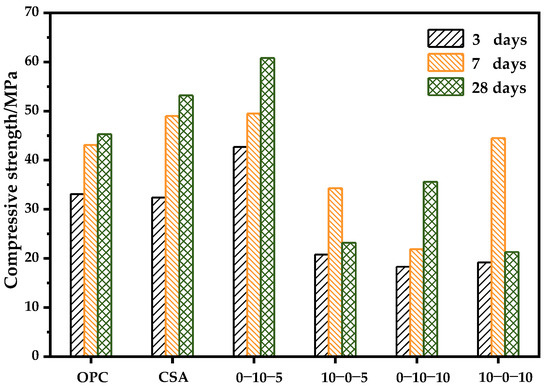 The compressive strength results of OPC-CSA-CS systems with two different dosages of CS are shown in Figure 15. It should be mentioned that some results for the OPC/CSA = 5/5, 6-4-10, 4-6-10, 7-3-10, and 8-2-10 groups could not be obtained because the failure of these specimens due to the swelling and cracking phenomena was observed in these samples before the target curing ages were reached.