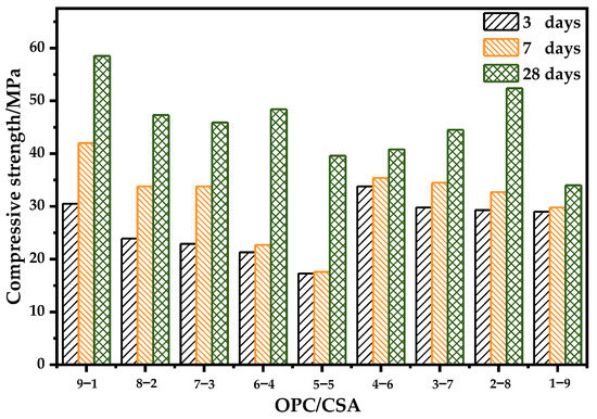 Figure 15b shows that when the dosage of CS is 10%, other experimental groups demonstrate a strength loss, except for OPC/CSA = 9/1, which may be related to the time inconsistency between the delayed ettringite formation and the setting and hardening of composite cement paste, resulting in the destruction of the microstructure and a reduction in its density [59]. The compressive strength decreases progressively with decreasing OPC content for the OPC-dominated cementitious system. Meanwhile, for the CSA-dominated cementitious system, the 7-day and 28-day strength decrease with the increasing CSA content and the 3-day strength is independent of the mass ratio of OPC/CSA. Furthermore, comparing two sets with the given mass ratio of OPC/CSA, it can be found that a higher C dosage leads to a lower strength, especially with regard to the late strength.