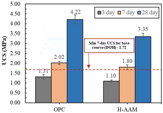 Preliminary research conducted at Chiang Mai University, Thailand, established that the H-AAM could be used as a stabilizing agent in road bases. The H-AAM and Portland cement (as a benchmark) were utilized as stabilizing agents, while the crushed rock was used as the parent material [45]. From Figure 1, it can be seen that the H-AAM achieved the target unconfined compressive strength (UCS) required by the Department of Highways, Thailand, on day 7 [46,47]. These UCS values showed that the H-AAM could be used to achieve the minimum strength required, even though its strength was less than that of the OPC-based material. Therefore, this H-AAM could be utilized as an OPC replacement in road stabilization. This study also explored the influence of AE on the flexibility and waterproofness of this material.