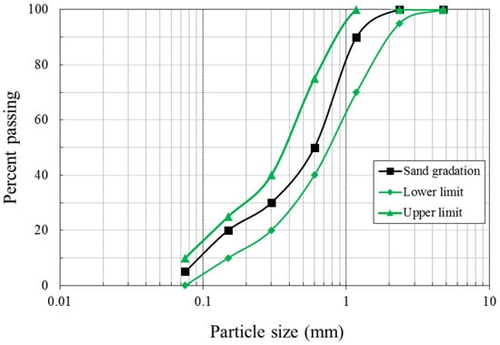 Based on Table 3, the hybrid alkali-activated mixtures with different CAE contents were prepared using the binder-sand ratio (b/s) of 1.00:2.75, in which the sand with specific gravity was 2.65 and the gradation shown in Figure 3. The control mixture as the H-AAM sample consisted of FA, HL, and NaOH, following Table 3. According to the previous study, the constituents of the H-AAM binder was validated the potential on cement replacement in road base construction [45]. Proportions of CAE to the hybrid binder of 0, 0.05, 0.10, and 0.20 were used in conjunction with the added water was water-to-binder ratio (w/b) of 0.45:1.00. For the microstructure and structural formation analyses, hybrid alkali-activated pastes with different CAE contents were prepared.