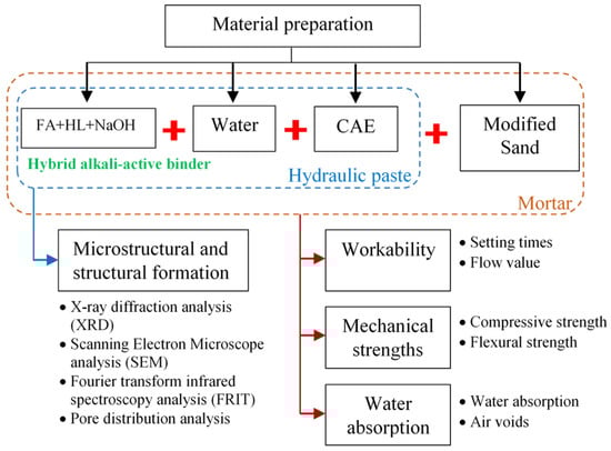 Figure 4 presents the perspective diagram for the research to clarify the preparation of the materials and the experiments. Mortar samples were examined to obtain the physical properties of the target specimens. Meanwhile, microstructural and structural formation analyses were performed on the hydraulic pastes.