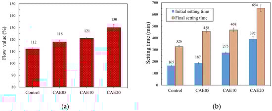 Figure 5 shows the test flow values and setting times of mortars with different CAE contents. The results indicate that the hybrid alkali-activated mortar’s initial and final setting time values were significantly delayed with an increase in CAE content—as was true for the flow values. The mortar with 20% CAE provided the highest flow value, which was much larger than the value for the control mortar, and the setting time of this mortar was approximately twice that of the control mortar. The increase in flow was due to the extra water, which was 35% by the total amount of the CAE. From Figure 5a, the mortar with CAE contents of 5 and 10% had 187 and 275 min initial setting times, respectively. The final setting values were 458 and 468 min, respectively, both higher than 326 min recorded for the control mortar.