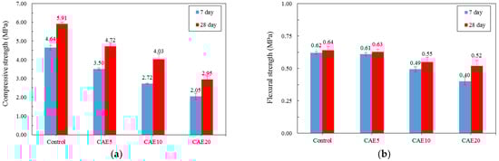 Figure 6a illustrates the compressive strength of the test samples with different CAE contents. A higher CAE content resulted in a lower compressive strength. With more free water available with a higher CAE content, the water-to-cement ratio of the mixture increased, leading to a decrease in the overall compressive strength of the material. Furthermore, asphalt droplets in the mixture can cover pozzolan particles, delaying the reaction and forming weak spots [54,55]. In terms of flexural strength, Figure 6b shows the relatively small decline in flexural strength with higher CAE content for both seven- and 28-day curing periods. Note the relatively small gaps in flexural strength between the seven- and 28-day curing periods, regardless of CAE content. It seems that the CAE content did not play a leading role in developing flexural strength in the materials.