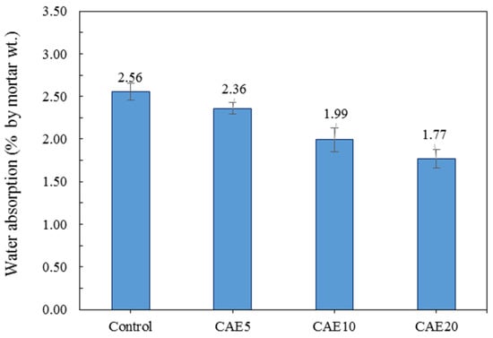 Water absorption values of the hybrid alkali-activated mortars with different CAE contents.
