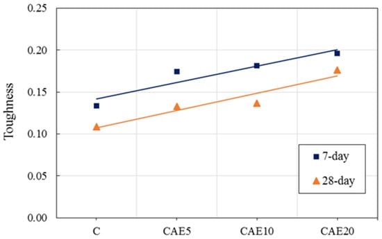 Figure 8 reveals the toughness characteristics of the H-AAMs with varying CAE contents. Note that adding CAE can increase the toughness of the hybrid alkali-activated mortars, with the highest CAE contents resulting in the most outstanding toughness. A material’s toughness generally indicates the brittleness and ductility of the material. Relatively higher material toughness implies flexibility, and the lower one indicates brittleness. Based on the toughness results exhibited in Figure 8, the presence of CAE in the H-AAMs provides ductility. These results agree with previous research, which indicated that more flexibility is present in polymer-modified cement-based materials [58,59]. Notably, more excellent material toughness indicates greater energy absorption, which is required for road pavement materials [60,61]. Therefore, CAE can generate better energy absorption behavior in the H-AAM, making it an ideal flexible road pavement material.