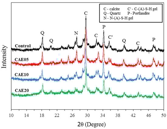 Figure 10 illustrates the XRD patterns of the H-AAMs after 28 days of curing. The broad hump in the region of 26–38° 2θ was found in all samples and shows the amorphous phase of the material. The phases consist mainly of calcite, Portlandite, C-S-H, and N-(A)-S-H [9,12,14,62,63]. The control paste showed the peaks of C-S-H and N-(A)-S-H gels more clearly than the others with the CAE mixed in, indicating that the CAE retarded the alkali-activated reactions of the mixtures. Consequently, reductions in mechanical strength ensued. This result is similar to that obtained for the cement-AE system in previous research [42].