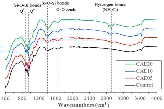 The FTIR results for the hybrid alkali-activated pastes with CAE contents are presented in Figure 11. Note that the intensities of the bands at about 835 and 960 cm−1 decreased as the CAE content increased. These two bands correspond to the asymmetric and symmetric stretching vibrations of the Si-O bonds, which can be considered part of the tetrahedrons in Q1 and Q2 from the structural formation of C-S-H [64,65]. The addition of CAE diminished gel formation. In contrast, the intensities of the bands at about 1375 and 2870 cm−1 increased as the CAE increased from 5 to 20% in the pastes. These wavenumbers refer to the stretching vibrations of the N-H bonds in ammonium chloride (NH4Cl), i.e., the emulsifier used in the CAE [66].