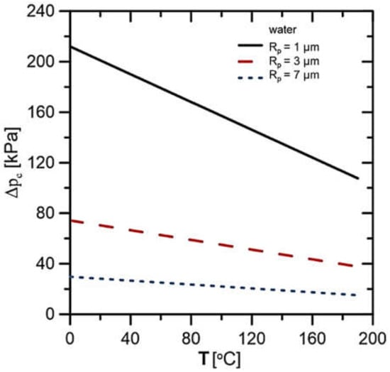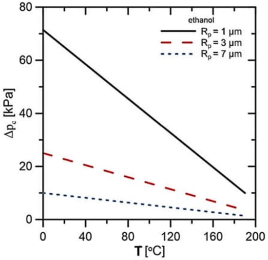 Considering the large variety of working fluids possible to apply in the LHP installation, it was decided to use the most common and previously applied working fluids in LHPs. Based on this analysis, the rig design requirements, physical properties of the working fluid and its possibility of generating the largest capillary pressures for further experiments were selected two fluids, namely distilled water and technical-grade ethanol. Such fluids are suitable for analysis due to their high potential to generate a capillary pressure difference in the porous structure (∆pc). A capillary pressure difference (∆pc = 2σ/Rp) depends on the surface tension of the working fluid (σ) and pore radius (Rp). Characteristics of the theoretically feasible capillary pressure rise as a function of temperature for water are presented in Figure 2 and for ethanol in Figure 3. Both cases presented the effect of pore size on the generated pressure rise. In the considered temperature range, it can be seen that water has a higher potential to create a capillary pressure rise for each of the considered wick pore radiuses. The highest values of ∆pc are obtained for the smallest values of the pore radius. With increasing temperature, the potential to generate ∆pc decreases.