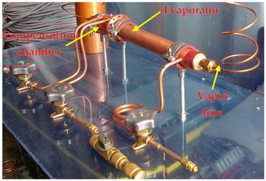 LHPs are very efficient heat transfer devices operating passively where the principle of operation is based on evaporation and condensation of the working fluid at a specific pressure related to the required conditions. In such a two-phase passive thermal control apparatus, extensive amounts of heat can be transferred with stable control of the heat source temperature. There has been a widespread effort to extend successful applications of LHPs to more common terrestrial applications [,,,,,,,] in order to develop more passive cooling systems, mainly based on liquid–vapour phase-change mechanisms to remove large heat fluxes. The electronic terrestrial applications benefit from the cooling advantages of LHPs (e.g., passive—electrical power-free, long-distance heat transfer, flexibility in design and assembly, robustness, antigravity capability, noise and vibration-free operation).