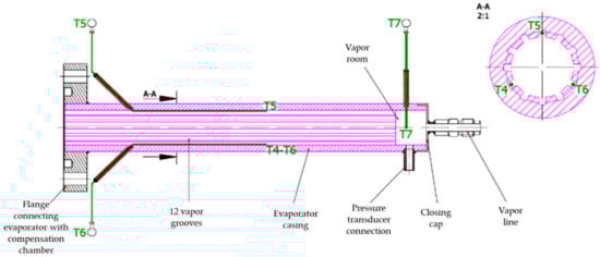 In this study, the evaporator filled with three different wick materials was tested. The evaporator design allows for the exchange of the porous wick. The outline of the evaporator is presented in Figure 4. A sintered stainless steel cylindrical wick material was manufactured by Tridelta Siperm GmbH, a provider of porous metals, and inserted inside the evaporator casing (Figure 5) []. The porous wicks have a mean pore radius of 1 μm, 3 μm and 7 μm, and porosity of 24%, 33% and 35%, respectively. Such material was selected for its high resistance to corrosion and chemical compatibility with water and ethanol []. The evaporator casing was made of copper. On the internal side of the evaporator’s casing, 12 longitudinal vapor grooves necessary for transporting vapor to the evaporator outlet were drilled. The cross-section of the evaporator casing is presented in the photo (Figure 6) and the schematic (Figure 7). The entire length of the evaporator is 216.5 mm.
