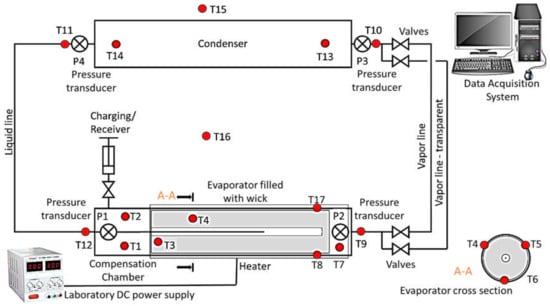 Figure 8 presents the outline of the LHP experimental facility where the location of all measuring points is indicated, whereas Figure 9 shows is the general view of the rig.