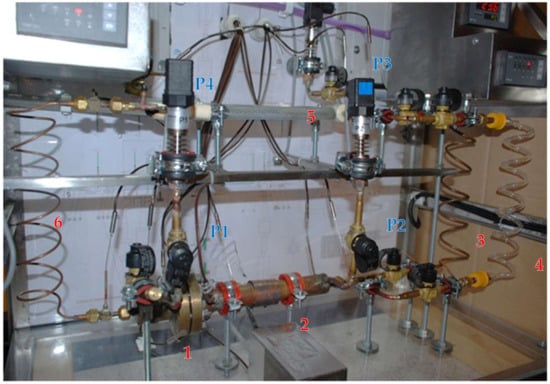 Photograph of the test facility with marked measurement points (before insulation): 1—compensation chamber; 2—evaporator; 3—vapour line; 4—glass tube for inspection of flow structure in vapour line; 5—condenser; 6—liquid line; P1, P2, P3, P4—pressure transducers.
