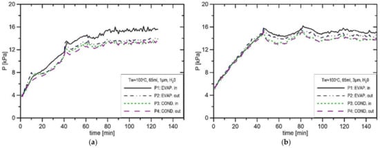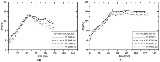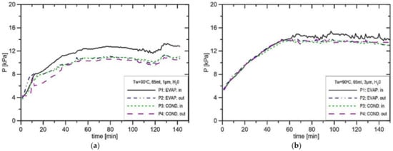 In the case of water, the results of pressure distributions are presented in Figure 10, Figure 11, Figure 12 and Figure 13 for the charge volume of 65 mL. Analysis of the developed pressure in the case of water as a working fluid shows the pressure values before and after the evaporator, which vary with respect to the applied evaporator saturation temperature and the pore size. The level of pressure drop in the vapor and liquid lines is much smaller with respect to the pressure difference P2–P1, where P2 is the pressure after the evaporator (the highest pressure in the loop). P1 is the pressure before CC (the lowest pressure in the loop). Some pressure fluctuations are observed in all pressure distributions; however, consistent pressure differences are noticed in the distributions. During the investigations, the measurement run lasted for about 2.5 h, from which we can detect that reaching the steady-state conditions lasted for the first 30 min.