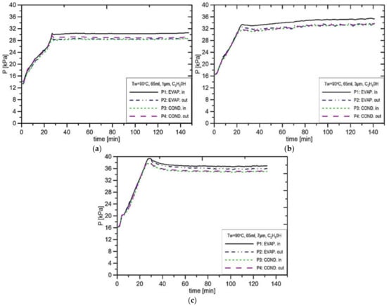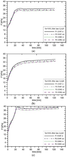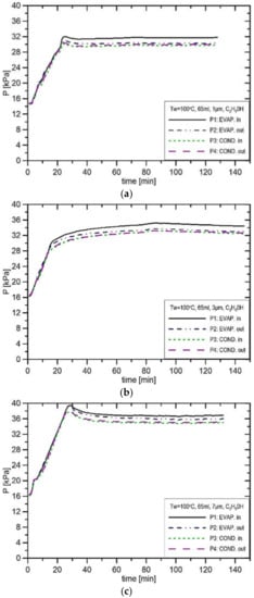 Figure 14 presents the results of experiments where the evaporator casing temperature is 100 °C at the filling volume of 65 mL. From the results in Figure 14a, the pressure in the CC is 32.0 kPa, and the pressure in the vapor line is 29.9 kPa; hence, the pressure difference at the installation is 2.1 kPa. In the case presented in Figure 14b, the pressure in the CC settled at the level of 35.0 kPa, and in the vapor line, it settled at the level of 33.0 kPa, which gives a pressure difference in the installation of 2.0 kPa. This pressure difference is smaller than in the case of the pressure difference from Figure 14a, which confirms the fact that with the increase in the pore size, the potential to produce capillary pressure difference decreases. In the case of pore size equal to 7 μm (Figure 14c), the pressure in the CC stabilised at the value of 37.0 kPa, and in the vapor line, it stabilised at the level of 35.0 kPa. In Figure 15 presented are the results of experimental runs with the evaporator casing temperature set to 110 °C and three different pore sizes of 1 μm, 3 μm and 7 μm. A similar character of changes as in the case of evaporator temperature settings of 90 °C and 100 °C is present. From the comparison of the three values of heater setting, with the increase in evaporator casing temperature, at the same value of the pore size, the potential to produce the capillary temperature difference decreases. Such a conclusion can be drawn by comparing Figure 13a,