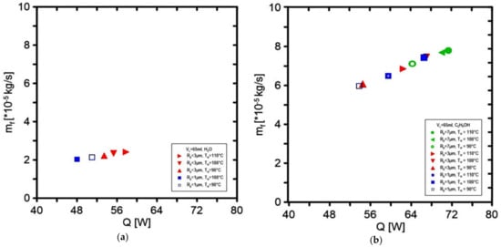 The mass flow rate in the function of applied heat flux for (a) water as a working fluid and (b) ethanol as a working fluid.