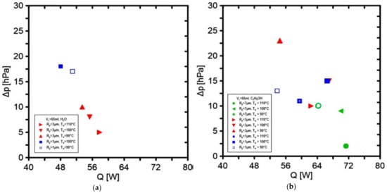 As mentioned earlier, the experimental analysis consisted of experiments at three different working fluid charges, 60 mL, 65 mL and 70 mL, three different wicks featuring pores of 1 μm, 3 μm and 7 μm, and three different evaporator casing temperatures, Tw = 90 °C, Tw = 100 °C and Tw = 110 °C. Two different working fluids were tested: water and ethanol. In total, 12 saturated pressure levels were recorded in the case of water and 18 saturation pressure levels in the case of ethanol, while the thermal load was varied. This paper presents the results of pressure difference possible to reach in the evaporator with a porous wick for two installation charging ratios and two different fluids. The range of investigated parameters is presented in Table 4. The subsequent discussion is given for the case of a single filling volume of 65 mL and two test fluids.