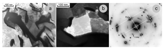 TEM images of Sample 2 (e = 12.5) annealed at 600 °C, 1 h: (a)—transverse section; (b,c)—longitudinal sections; c dark-field image in (110)Nb and (111)Cu reflections.