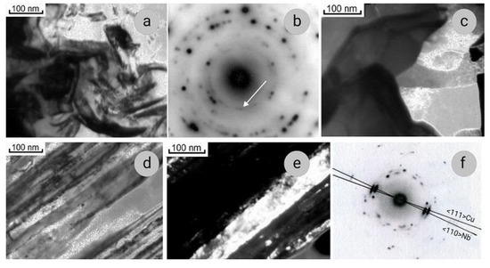 Microstructure of transverse (a–c) and longitudinal (d–f) sections of Cu–18Nb composite, Sample 2: (a,d)—bright-field images; (b)—SAED; (c)—dark-field image in (220)Cu reflection; (e)—dark-field image in (110)Nb and (111)Cu reflections; f- SAED, zone axes [110]Nb and [111]Cu.
