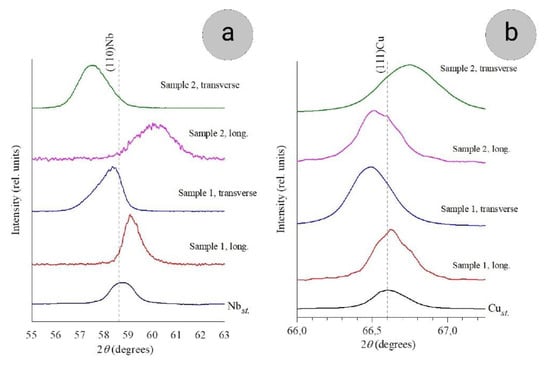 Along with the noticeable broadening of X-ray lines, corresponding to the presence of internal stresses in both constituents of the composite, a shift of the peaks relative to the reference values, especially in niobium, was also found (Figure 4). The peak shifts indicate lattice distortions. The shift of the peak depends both on the section plane (transverse or longitudinal) and on the strain degree. In the diffraction patterns from the cross-sections, the (110)Nb peak is shifted towards the smaller, and from the longitudinal sections, towards the larger Bragg angles (Figure 4a), and with the strain increasing, these shifts become larger.