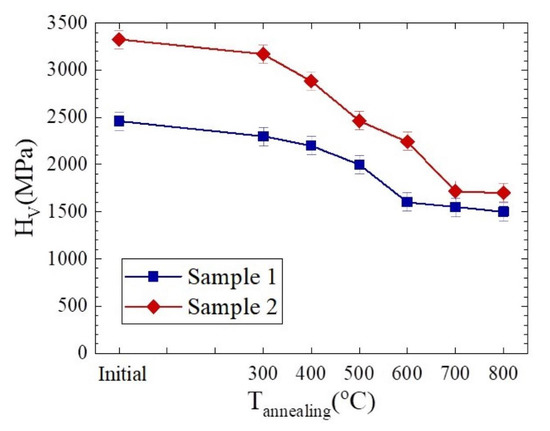 The behavior of Cu–18Nb composites (Samples 1 and 2) under heat treatment was studied, after which their microhardness and microstructure were investigated. Figure 5 illustrates the microhardness behavior under annealing. Over the entire temperature range, the composite with higher strain exhibits higher microhardness but sharper decrease in it. A similar behavior was found in niobium processed by high pressure torsion, namely, after the higher degree of deformation, the sharper drop in microhardness was observed in the annealing range of 400–600 °C [44].