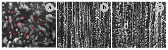 SEM images of Sample 2 (e = 12.5) after the annealing at 800 °C, 1 h: (a)—transverse section; (b,c)—longitudinal sections.