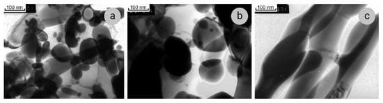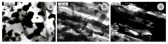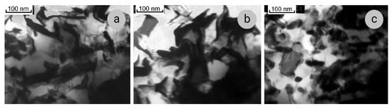 The results of TEM studies are shown in Figure 7, Figure 8 and Figure 9. Some thickening of the niobium ribbons in the cross-sections of Sample 2 is seen after the annealing at 300 °C (Figure 7a). Further development of this process is observed after the 400 °C annealing (Figure 7b). The Nb filaments are not uniform in thickness, their edges being darker and middle parts lighter. Thus, the edges are less transparent to the electron beam of the microscope, which indicates their distortions and the loss of coherence at Nb/Cu interfaces. At 500 °C, the ribbons of niobium become rounded in cross-sections (Figure 7c), which is evidence of the beginning of the bamboo-like structure formation (niobium ribbons transform into cylinders).