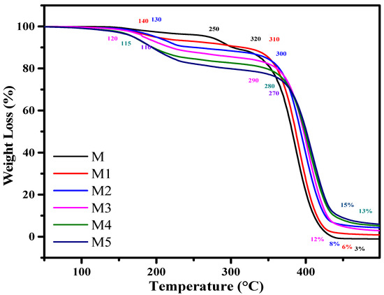 TGA curves for neat PMMA (M) and composites (M1–M5).