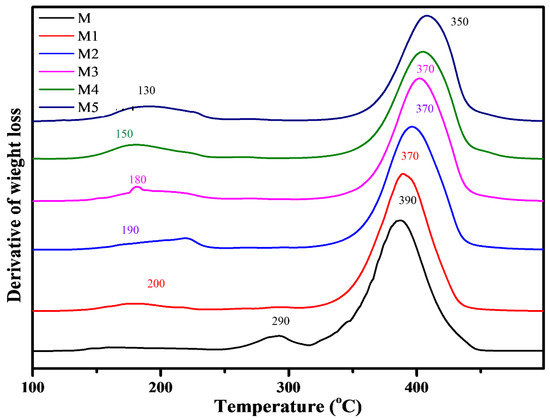 DTG curves for neat polymer M and composites (M1–M5).