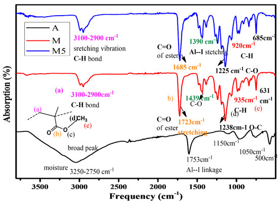 FTIR study of the pure additive gives identical stretching for AlI3. Due to the hygroscopic nature of the additive, a broad peak is identified in the range of 2750–3250 cm−1, which represents the presence of water. The other peaks are observed at 1753, 1550, 1150, 1389, 1050, 750, 650, and 500 cm−1 due to Al-I linkage. The peak around 1535–1635 cm−1 indicates the ester functional group linkages for M. The region of spectra 1630–1640 cm−1 gives no peak, which shows the transformation to a polymeric form of the compound and the absence of unsaturation. The saturated C-H stretching was identified around 3100 cm−1. The FTIR spectra of the composite system (M1–M5) were identified with a different concentration ratio of polymer (PMMA) to additive (AlI3). It is representative of peaks for PMMA to have altered positions. This may be due to the formation of the composite and certain physical associations being developed between components of the composite. For composites, the peaks for ester functional group bonds of PMMA appear at the lower frequency at 1616 cm−1 [24]. whereas Al-I stretching is either absent or appears at a higher frequency. The composite system peaks identified at 1316, 786, and 693 cm−1 are identified as the certain interaction between AlI3 and PMMA, as shown in Figure 3. Both PMMA and AlI3 were soluble in acetone and mixed at the molecular level.