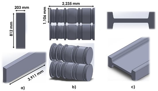 Figure 3 shows the gap between the work rolls for each pass to understand the sequence and order of the groove used for the rolling passes. The geometric characteristics of the beam blank entering the U1 stand are: 812.8 mm wide, 203.2 mm high and 3911.60 mm long, equivalent to an initial cross-sectional area of 0.165 , a volume of 0.646 and a mass of 5071.44 kg. These dimensions were used to predict the reduction percentage per pass (Equation (9)) and reduction ratio or final length per pass (Equation (10)) [11].